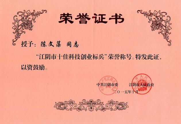 中共江阴市委、江阴市人民政府于2015年9月在全市开展了2015年度江阴市科技创业标兵、江阴市科技创新标兵评选活动。经单位推荐、辖区初审、专家评审等多道程序,我集团亚娱体育下属亚娱体育app官网(中国)有限公司总经理陈文藻同志正式被评为“江阴市十佳科技创业标兵”荣誉称号,并在10月23日召开的“江阴市第二十五届科技节暨大众创业万众创新工作推进会”上受到了江阴市委、市政府的表彰。